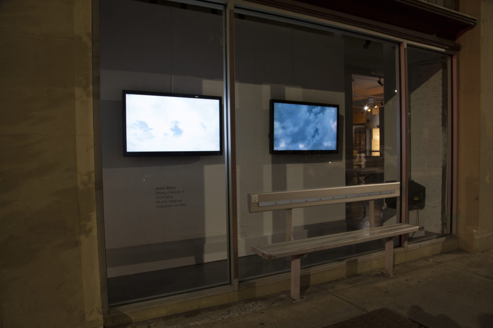 Berry's installation proposes the video game as a site for non-competition, aesthetic wanderlust and contemplation. Two high-definition monitors display magnificent skies that transition from day to night. While the videos appear to be documentary footage, the recordings are revealed as vistas from the fictional landscape of Skyrim, a video game developed by Tod Howard in 2011. Upon its release, Skyrim received rave reviews for its "open world" format, which allows players the freedom to travel anywhere at any time and to ignore the main quest indefinitely, gaining points even for sensitive activities, such as picking flowers.